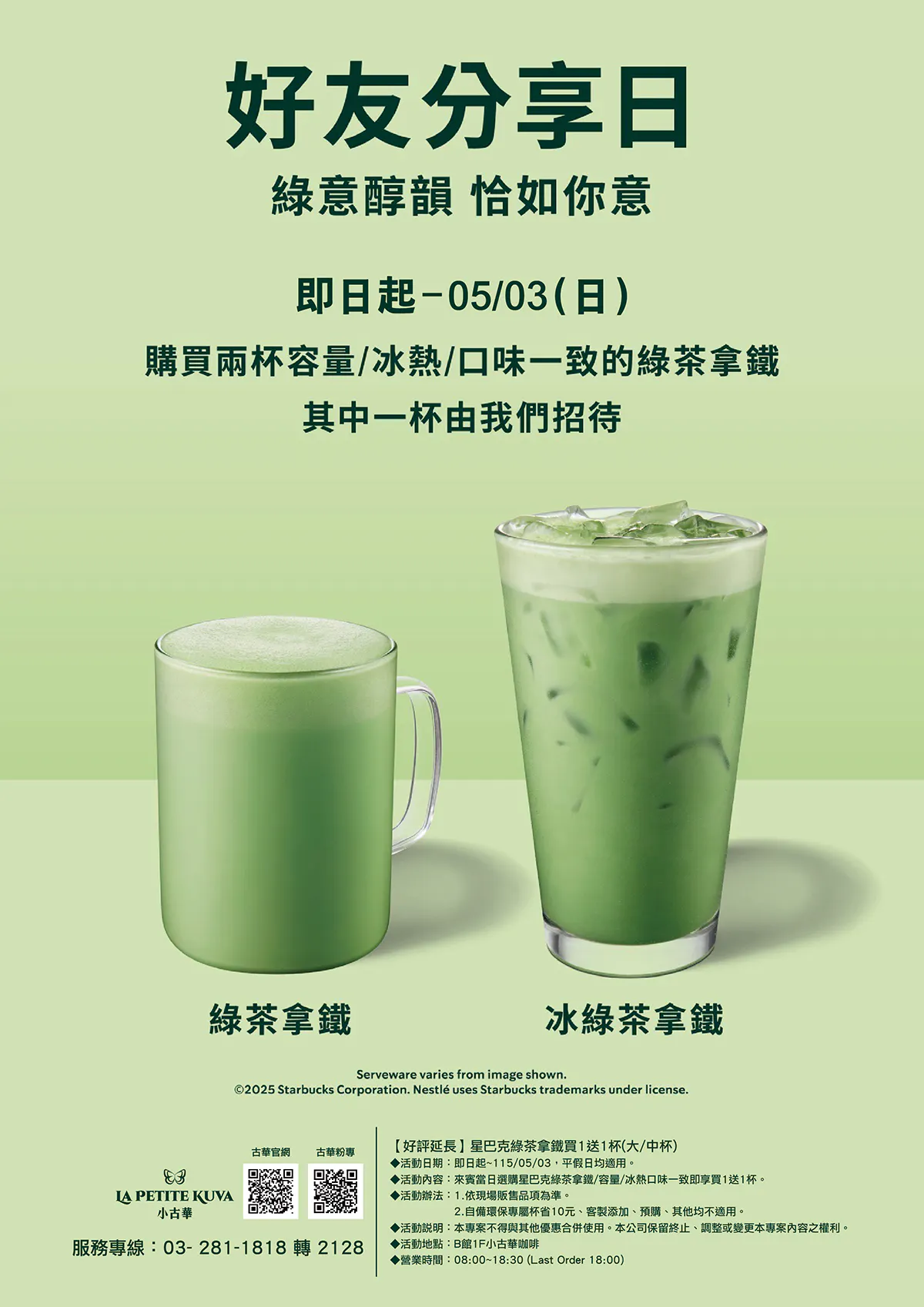 Promotion Details: Purchase a Green Tea Latte (medium or large size; same size and same iced/hot option required) and enjoy Buy 1 Get 1 Free.