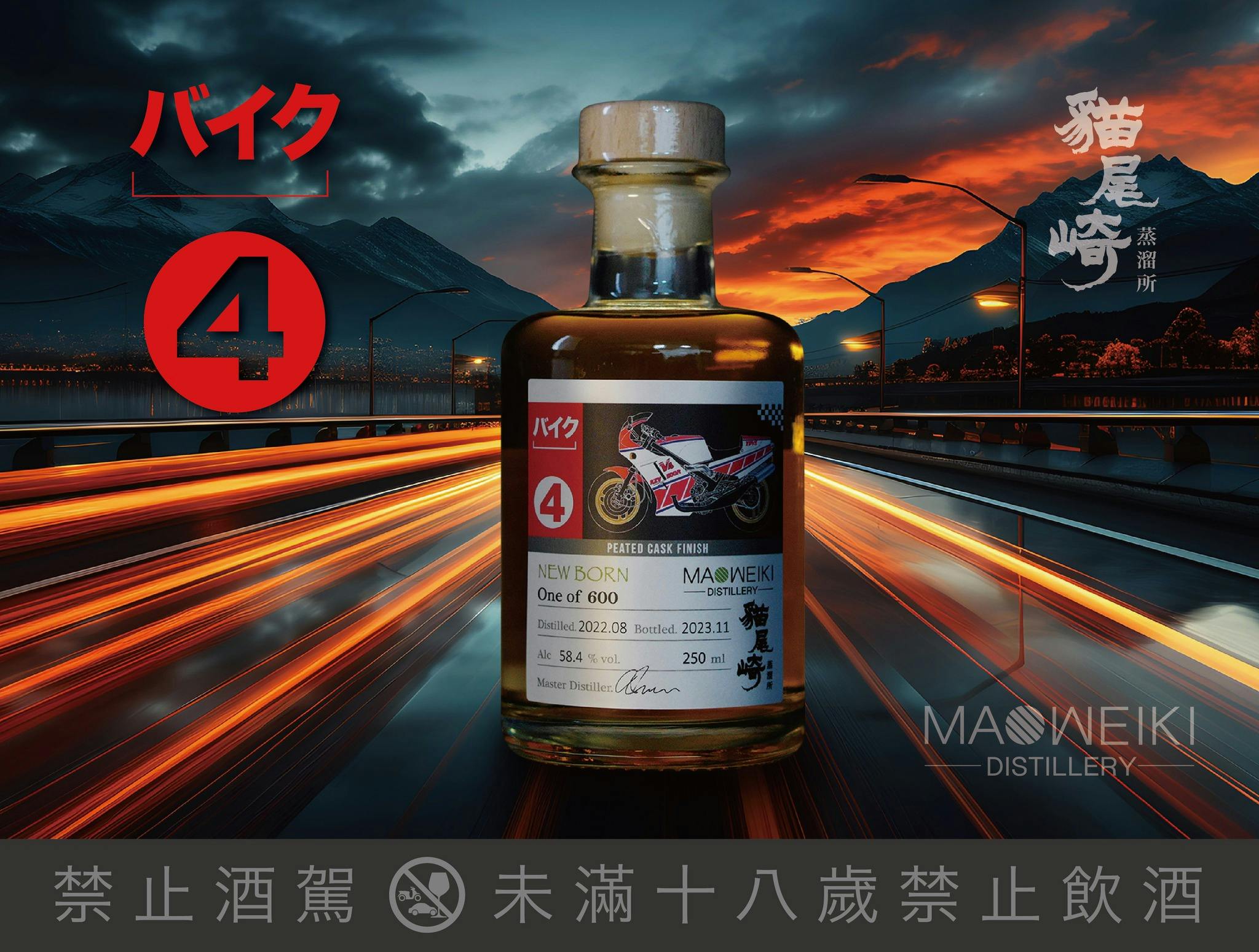 經典的摩托車標,250ml精巧瓶裝,Peated Cask Finish,原酒強度58.4%,限量600瓶,摩托小威4號「RZV500R」,貓尾崎的泥煤過桶首部曲,絕對不能錯過的經典風味。