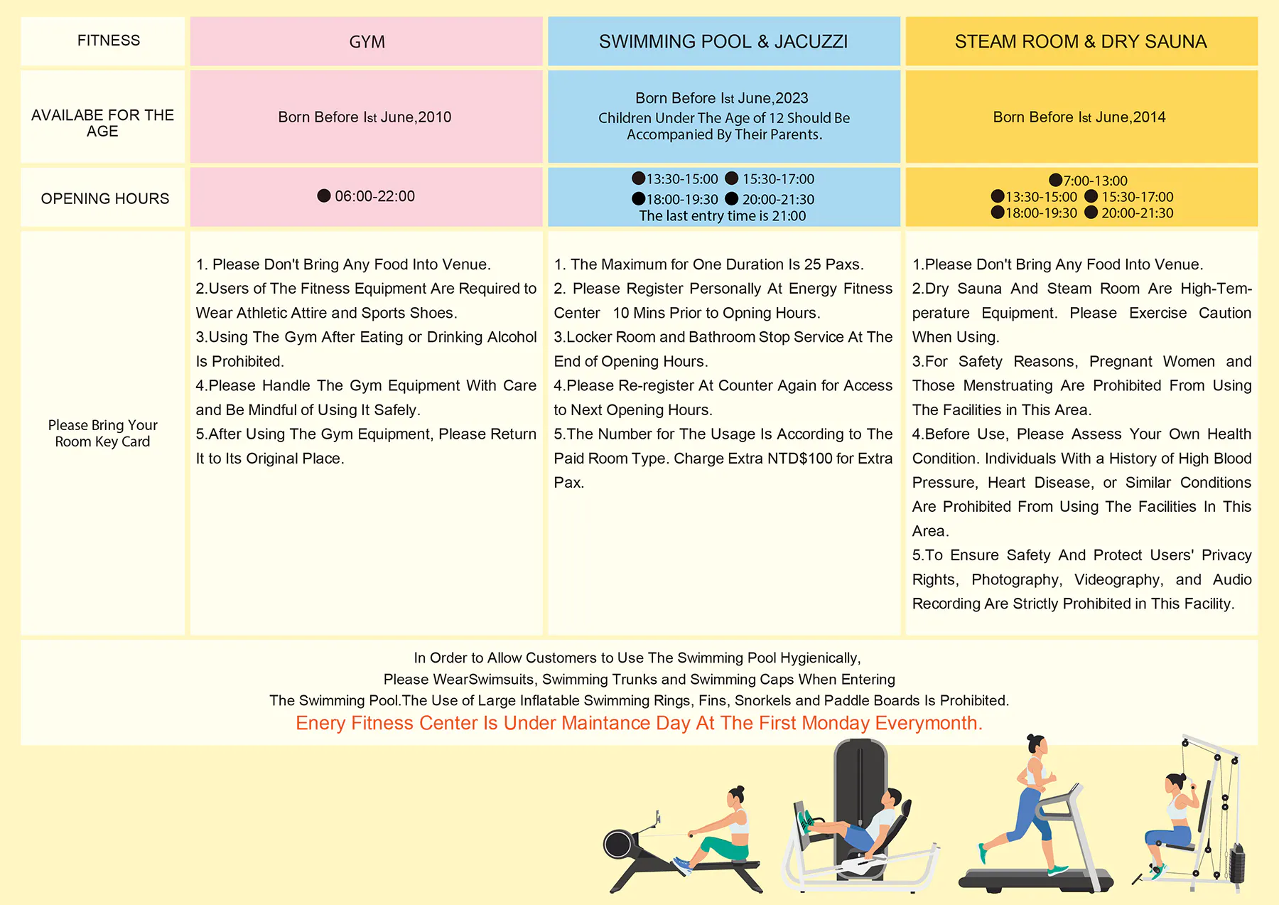 | 健身房 Gym:限16岁及以上使用(出生日期需为2010年06月01日或之前)