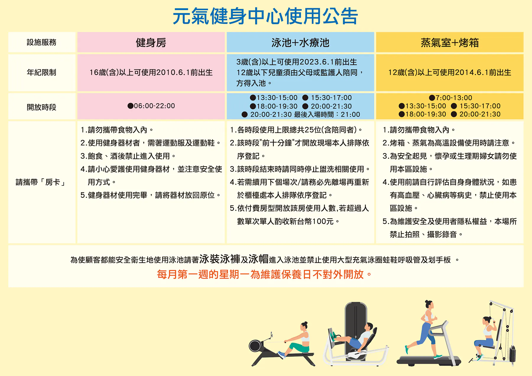 每月第一周的星期一为保养日,健身中心不对外开放